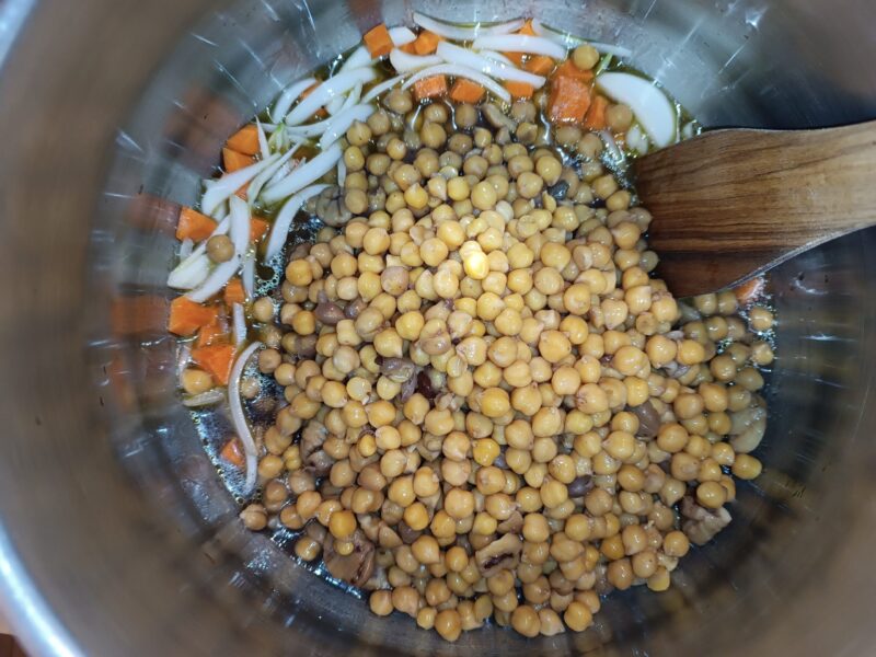 Use dried chestnuts and chickpeas soaked the night before, and after sautéing carrot, onion, and celery, add the legumes and the halved pig’s trotter, cover with water and start a slow cooking