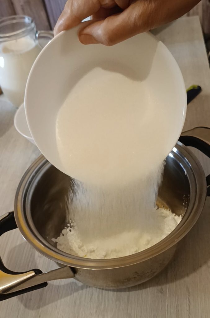 In a saucepan, combine the cornstarch and lemon sugar and mix, then add the yolks and stir, adding a little warm milk at a time until you get a cream, then add all the milk; blend well to avoid lumps, if necessary, blend for a few seconds first.