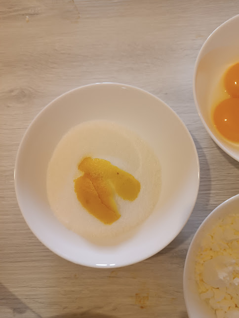 Start by preparing the ingredients for the cream, in the coffee grinder, reduce the sugar and lemon zest into a fine granulate.