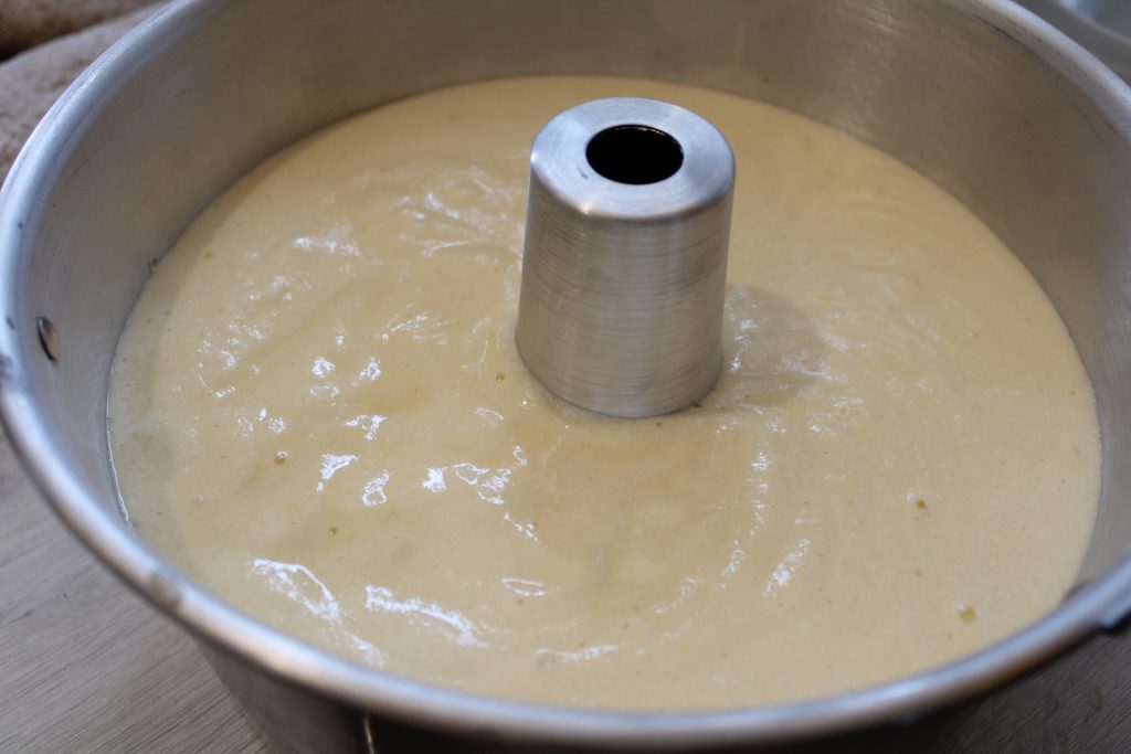 Use a chiffon cake mold (tall, with a central tube and preferably non-stick). This allows the batter to “cling” to the edges and rise well. Do not grease or flour the mold!