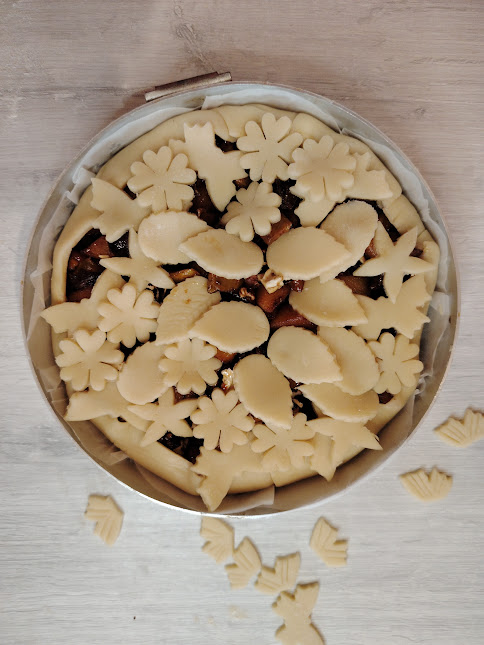 While the apples cool, roll out the shortcrust pastry and line the mold, save the shortcrust for decoration, arrange the filling, and decorate.