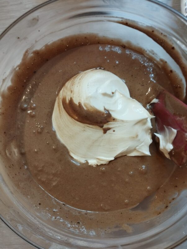 Meanwhile, beat the egg whites until stiff and then add them to the mixture, place in a round pan about 10 inches and bake at 375°F until cooked.