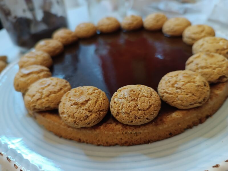 The creaminess of mascarpone blends with the taste of almond and coffee. To decorate the cake, I used unsweetened cocoa and sugar decorations.