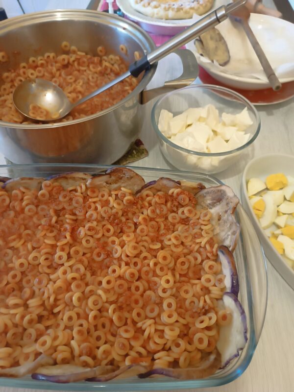 After cutting the hard-boiled eggs into wedges and the mozzarella into pieces, fill the surface, sprinkle with pecorino, and cover with the rest of the anelletti.