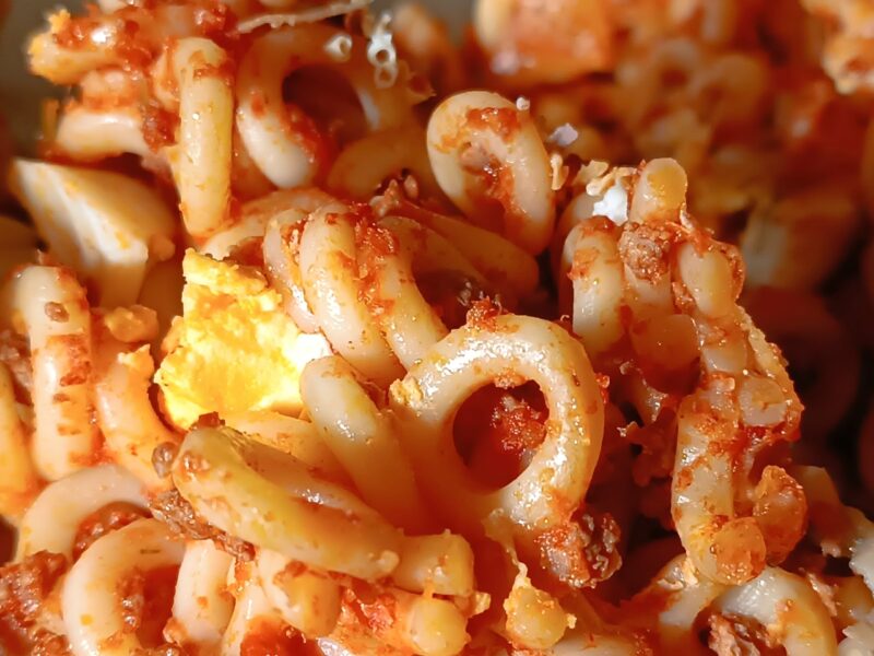 Anelletti, tomato sauce, hard-boiled eggs, and mozzarella