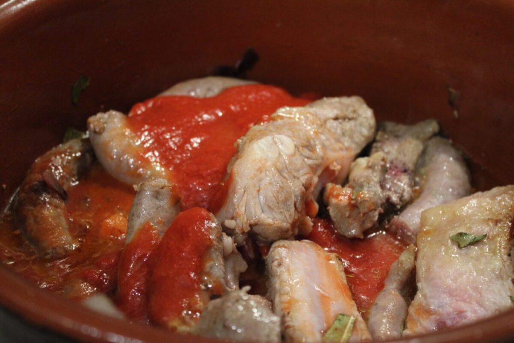 In the pot, brown the ribs, sausage, and cut vegetables, whole garlic, herbs, and chili pepper; if you chop them, add them after browning the meat otherwise you risk burning them.