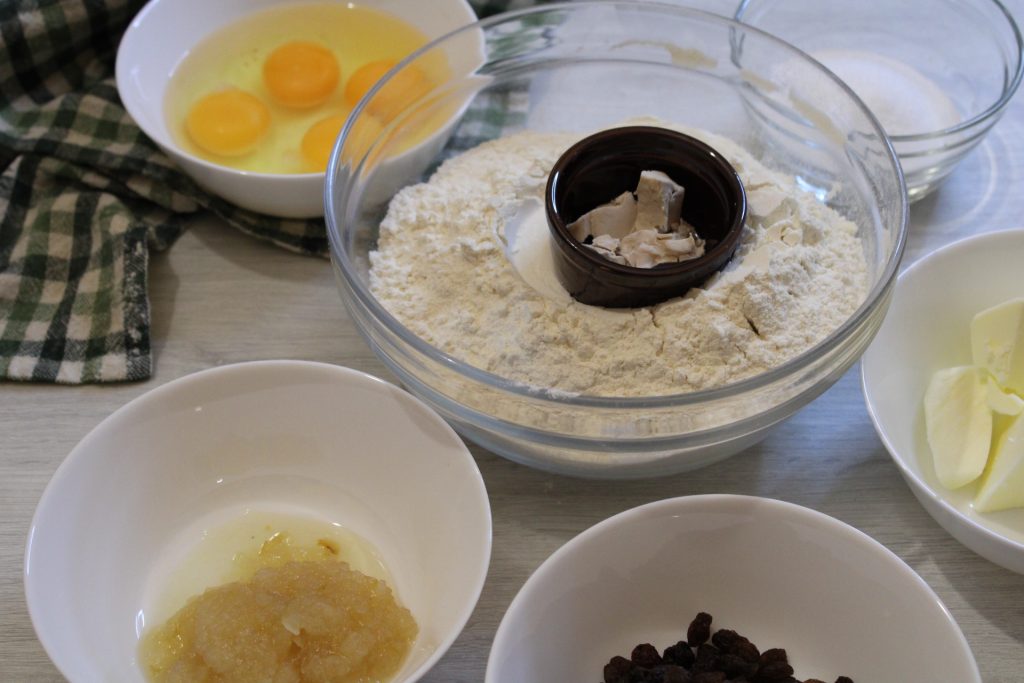 Finally, add the citron and raisins, knead further and close the dough inside the bowl. Let it rest in the refrigerator until the next morning, or in the evening. I often recommend this step for risen dough; in the kitchen, there is not always time. With this method, you will achieve an initial rise that will improve your dough, use less yeast, and the texture will be softer.
