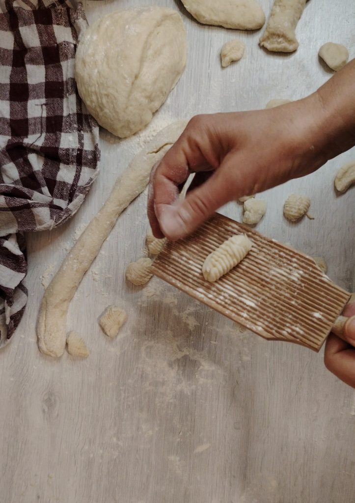 Then roll them on a gnocchi board. In Calabria, there is a wicker tool used for this purpose.
