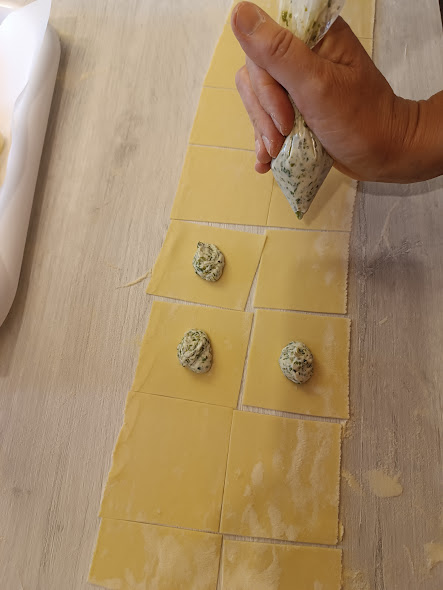 Knead the egg pasta, roll out, and cut squares for the cappellacci