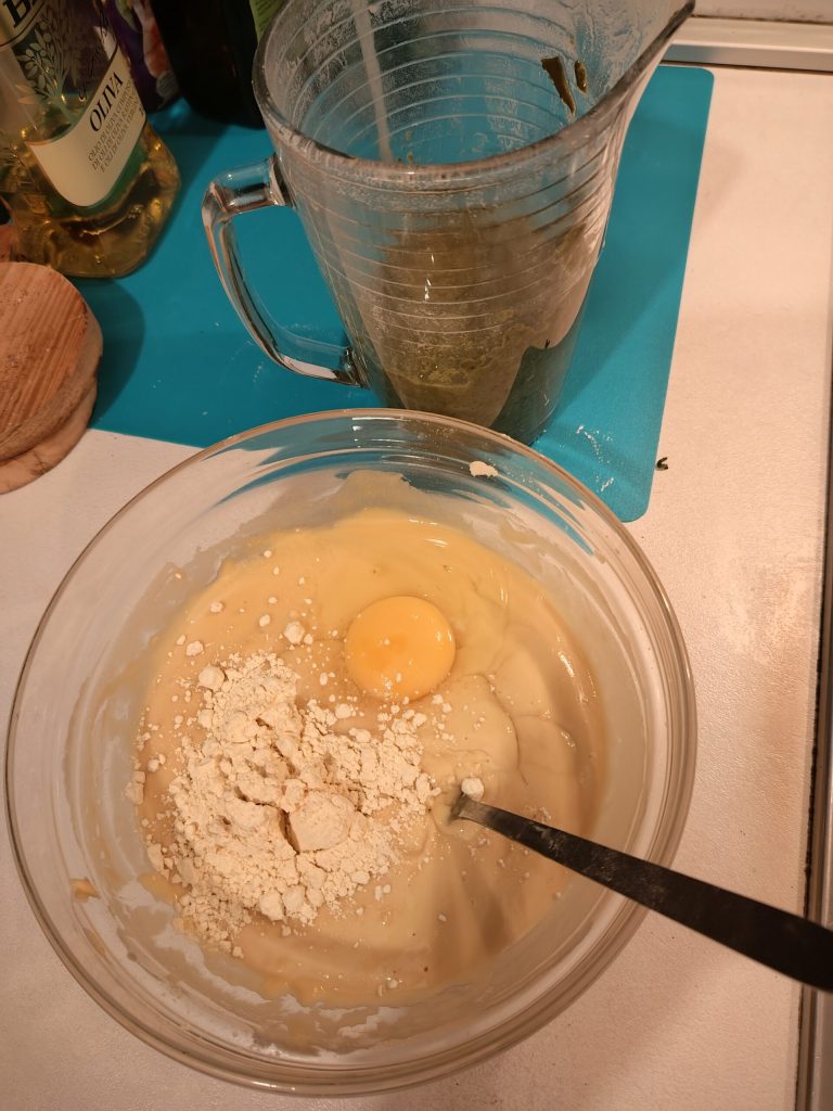 In the morning, put the chickpea flour with the water and salt in the bowl. Leave until use. Six hours is indicated; if eight pass, nothing happens. Take your batter and add the egg, pepper, and breadcrumbs, just one tablespoon, mix.