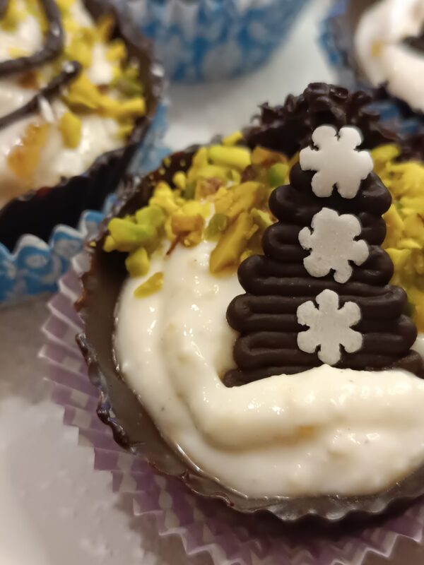 Recipe for chocolate baskets with ricotta and pistachio heart. Easy and delicious