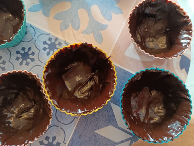 Silicone cups, bowl to melt the chocolate in microwave, bowl to work the ricotta