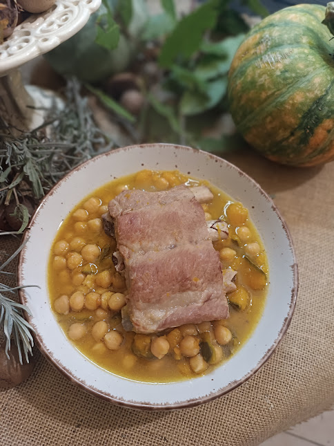 After soaking the chickpeas overnight in water with a teaspoon of baking soda, rinse them and transfer them to the cooking pot, add the leeks, carrots, celery, and pumpkin cut into pieces, the pumpkin a little larger; cut the rind into strips, add it to the rest and top off with water until everything is covered. Salt and start cooking by covering the pot