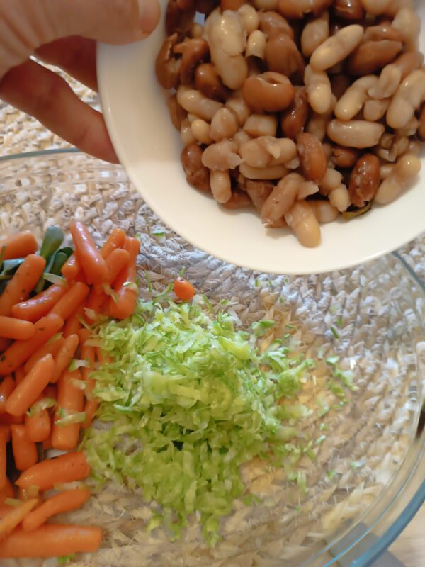 Among zucchini, last year’s beans, small carrots, spring onions, and purslane… I was already savoring my pasta salad… Maybe it was the hunger too!… Who knows?