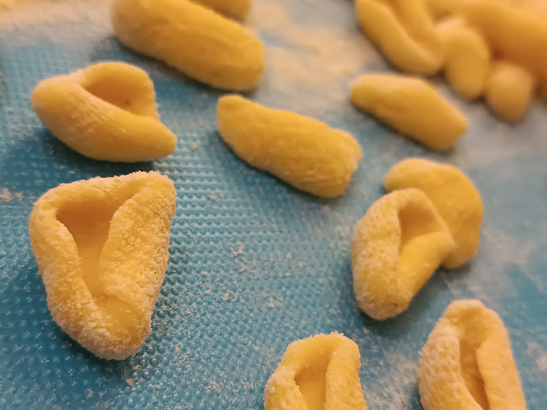 • Make small rolls and cut into chunks; drag them with your thumb to curl them… It’s shown in the video