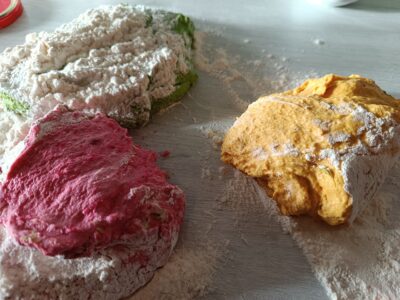 Divide the flour into four different bowls and add the vegetables or spices, salt, and knead each separately by hand or in a stand mixer. Divide the prepared water with yeast equally; if more liquid is needed, add it plain (without yeast). Since the vegetables will naturally be more watery, you’ll need less, while for the yellow and brown dough you need a few more drops