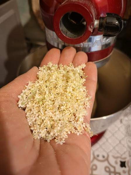 And add the elderflowers without the green parts. Knead for a few more minutes.