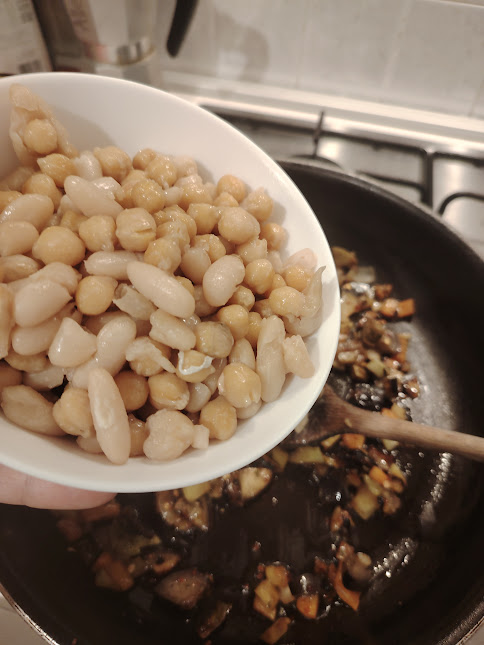 • Finally, add the beans and chickpeas already cooked previously. Meanwhile, bring the pasta water to a boil and cook the tubetti; then mix them with the vegetables after draining the excess liquid, keeping a little aside to avoid drying out too much.