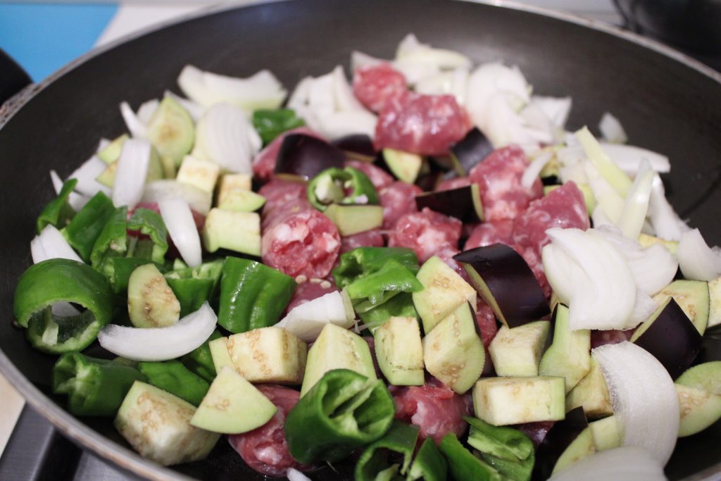 Remilled semolina, fresh tomatoes, crumbled pepper and eggplants