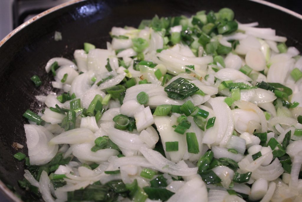 In the meantime, slice the spring onions into rings and sauté in a pan with a little oil until cooked.