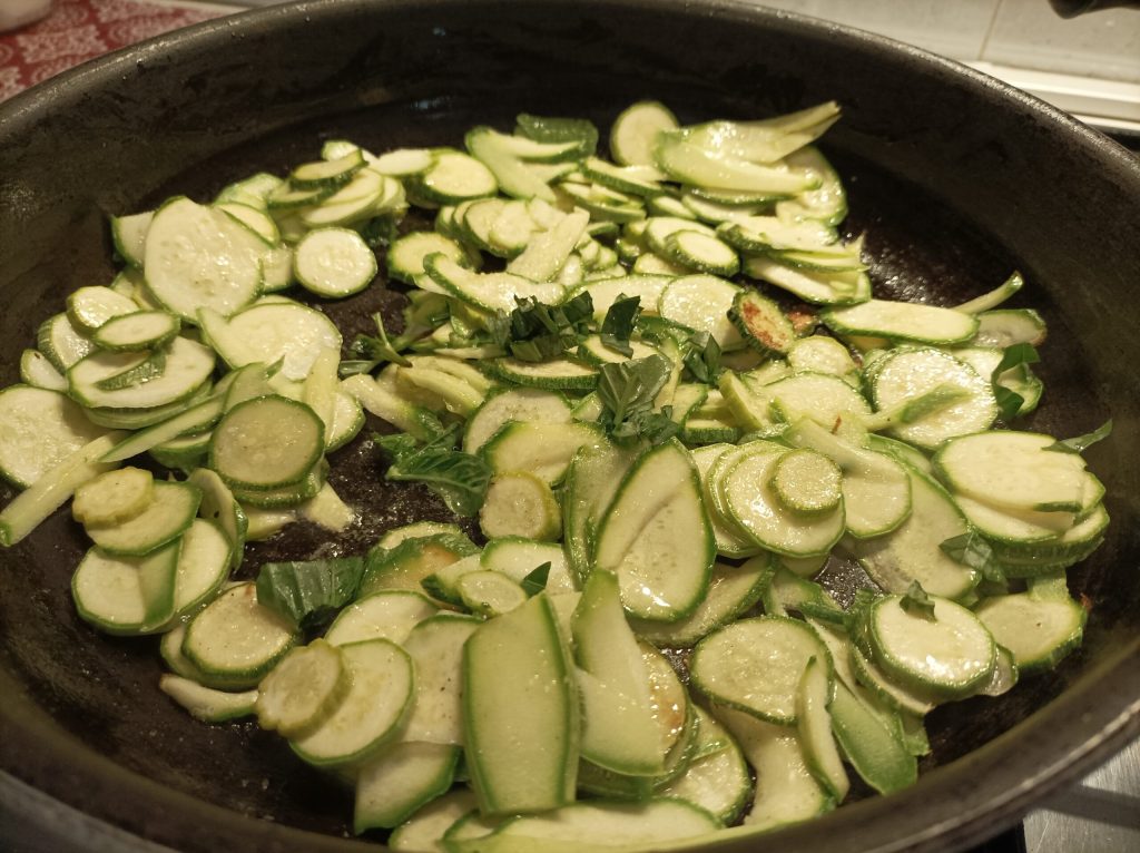 Slice the zucchini and brown them in a pan with oil, salt, basil.