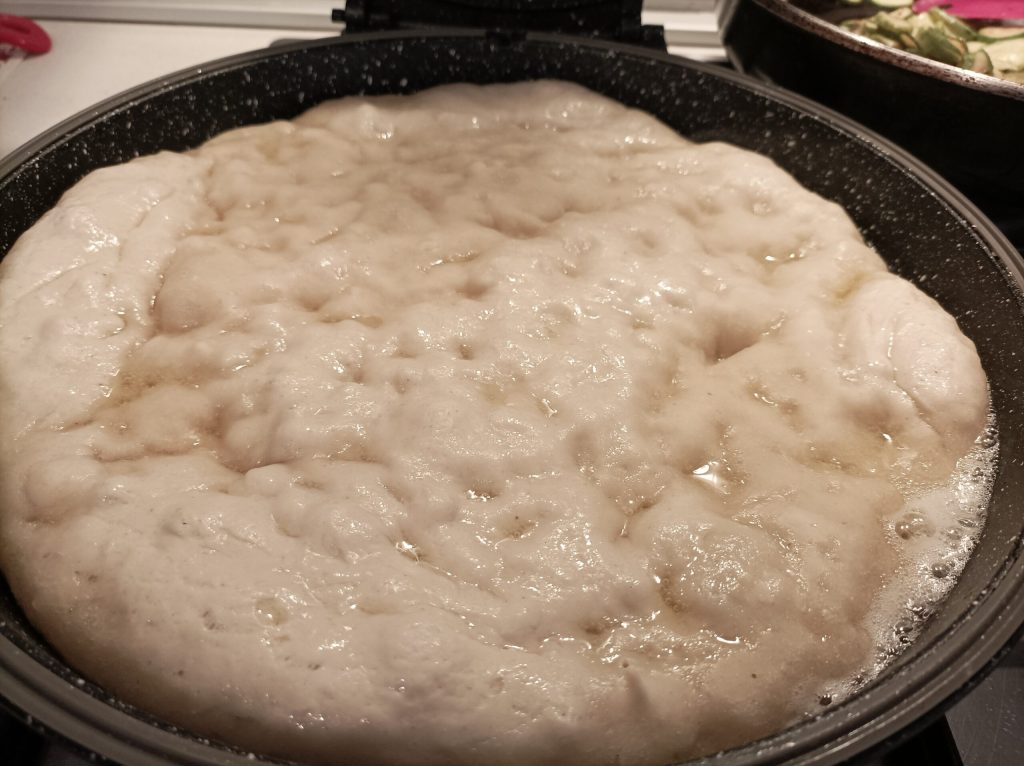 This morning I refreshed the sourdough starter, and with the excess, I prepared the focaccia to cook in a pan for dinner. With the heat, I use the oven less. I’m trying other cooking methods. The double pan helps me out.
