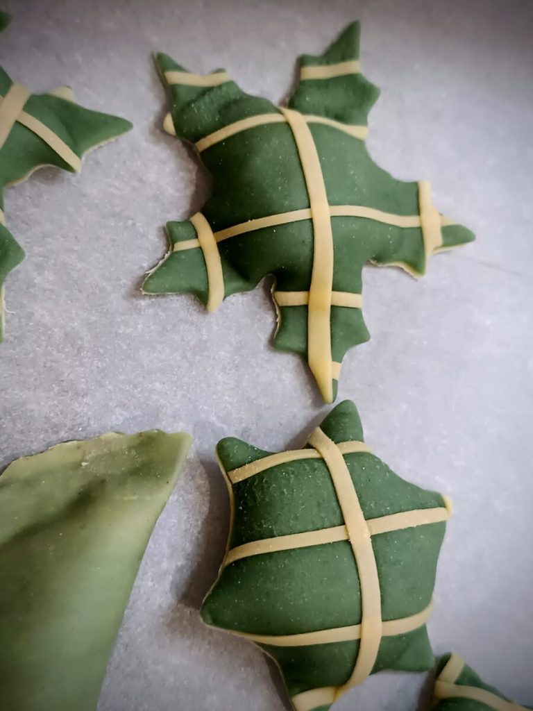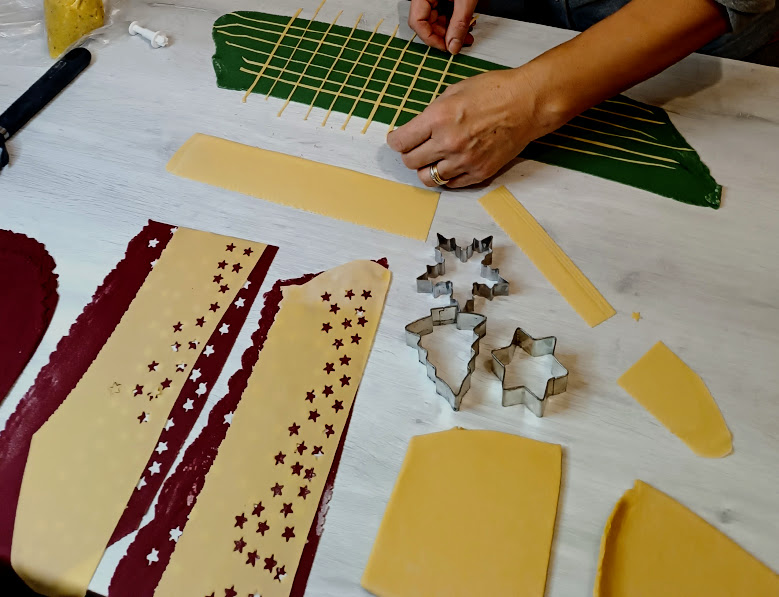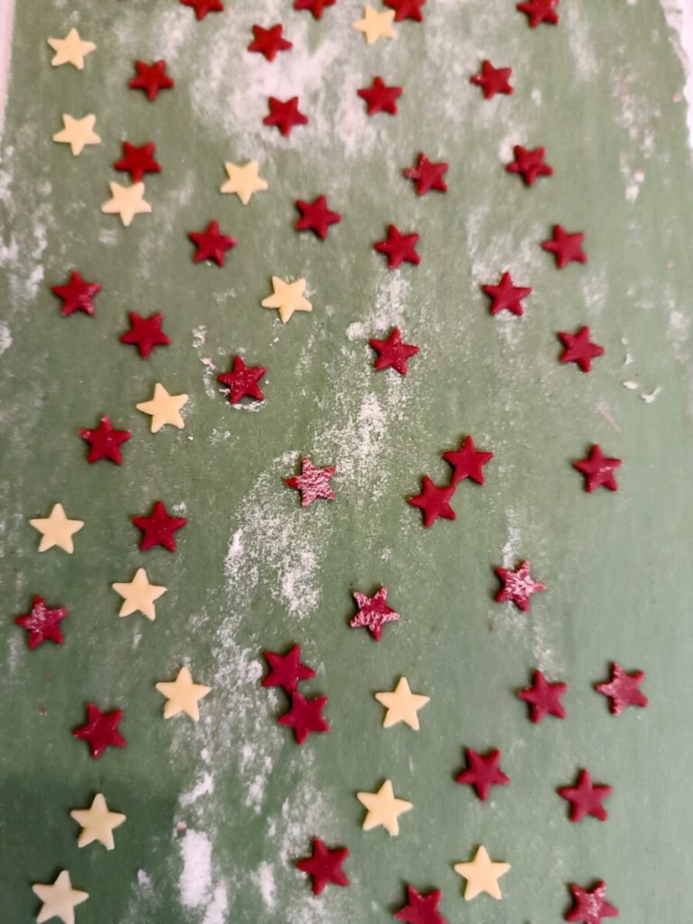 Roll the sheets and cut the stars; apply them on the top only on the upper sheets, and pass with the rolling pin to fix them