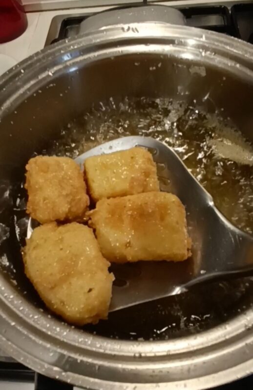 She made it with fresh lemon peel cut very fine, or grated; and after resting it in the fridge, inside that crunchy breading was a creamy filling with a lemon aroma!