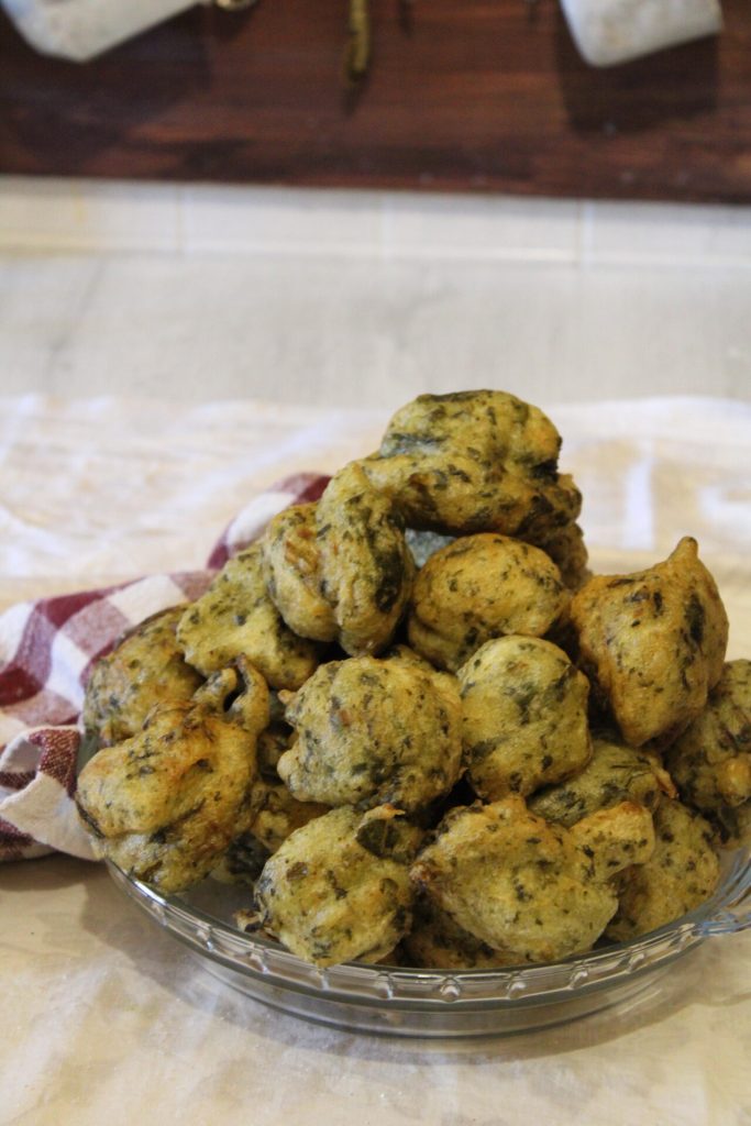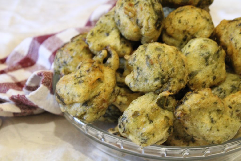 In this case I used borage; sometimes I use other wild herbs, or zucchini, or eggplants — zucchini grated raw, while eggplants are pre-cooked in a pan. A tasty and inviting appetizer!