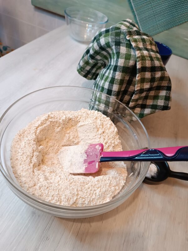 In the meantime, mix the flours and salt; after about ten minutes, pour the lactic solution and knead carefully, and add the baking soda; knead well