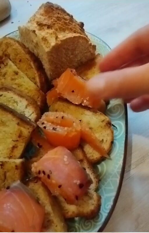 After toasting the bread, place the salmon, and the rest of the toasted slices in the dishes