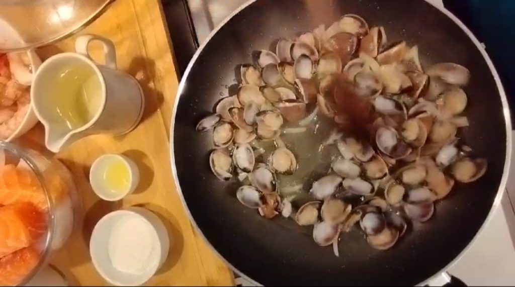 In the meantime, sauté the onions; add the clams, cover to open them, pour in the wine, and let it rest until their use