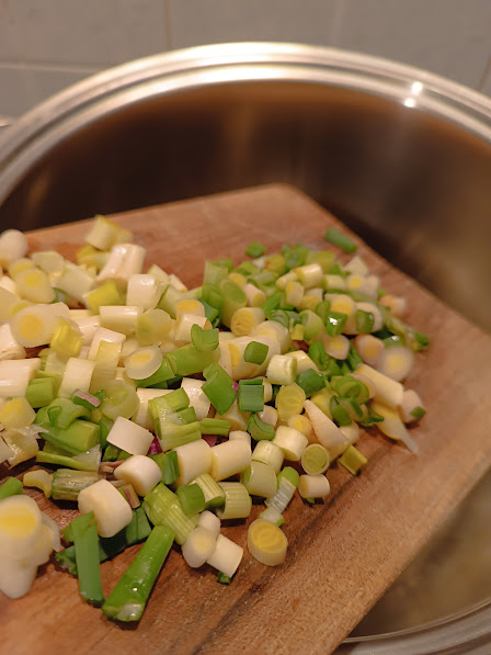 A quick trip to the garden for scallions and then we start with the macaroni with broad beans