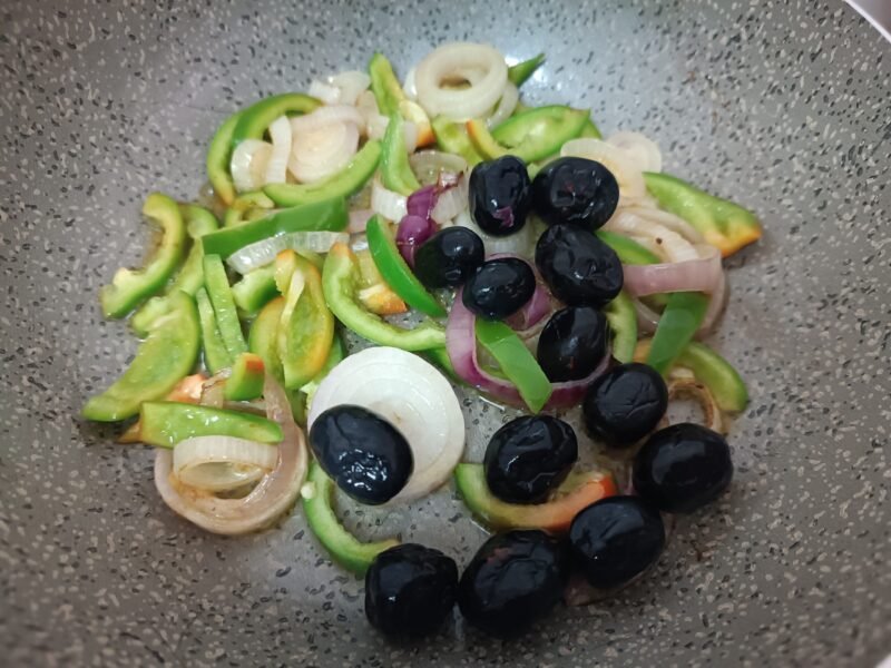 Meanwhile, cut the peppers into strips and add them along with the olives to the sautéed onions. If you like, add a spicy chili pepper and cook for 6–7 minutes.