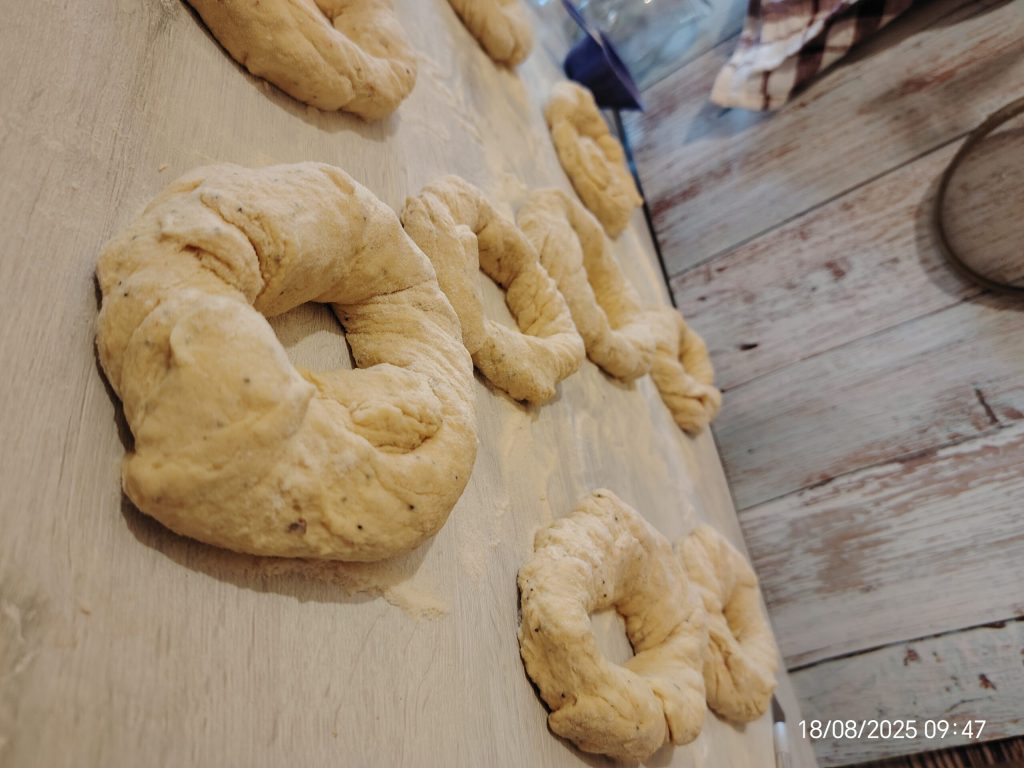 Cut pieces and make long loaves, which you then fold onto themselves and twist, close into a ring, and give an additional twist. This technique is used to give elasticity. It increases the alveolation and gives softness.