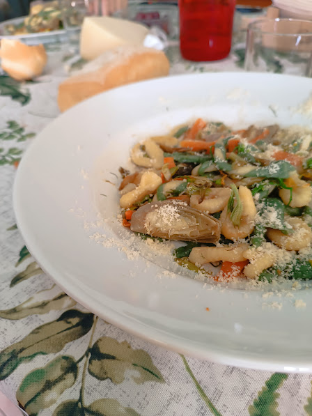 Cook the spizzulus in plenty of salted water and sauté with the artichokes and vegetables, also add the aromatic mixture and serve with grated pecorino cheese