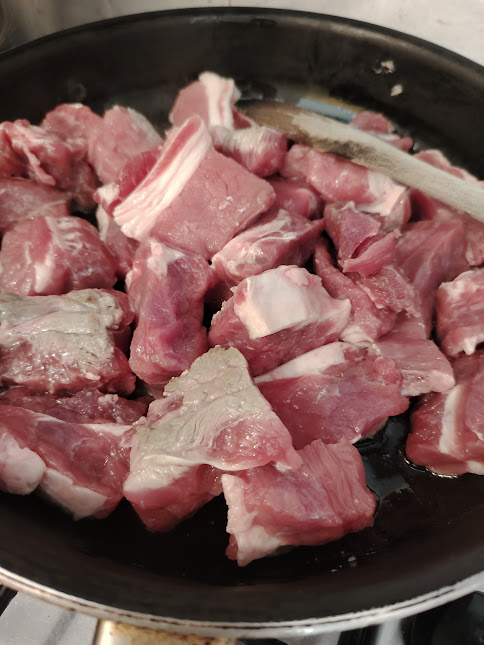 In the meantime, fry the thinly sliced onion, mushrooms (if using dried mushrooms, soak them beforehand), and chopped hard herbs with the pork cheek cut into strips in a little oil.