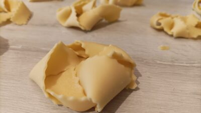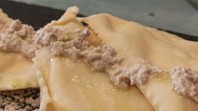 A stuffed pasta I’ve known for a lifetime, which I’ve prepared many times, both for the taste and the shape… I often use wild herbs, but also garden vegetables, borage, ribs, or lamb’s quarters.
