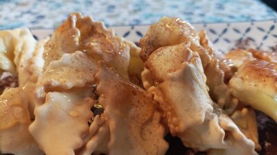 The grandmother shaped them into triangles, and I continued with this characteristic. Naturally, in the kitchen with the little one, we played, and our pansoti never came out the same size. Certainly delicious.
