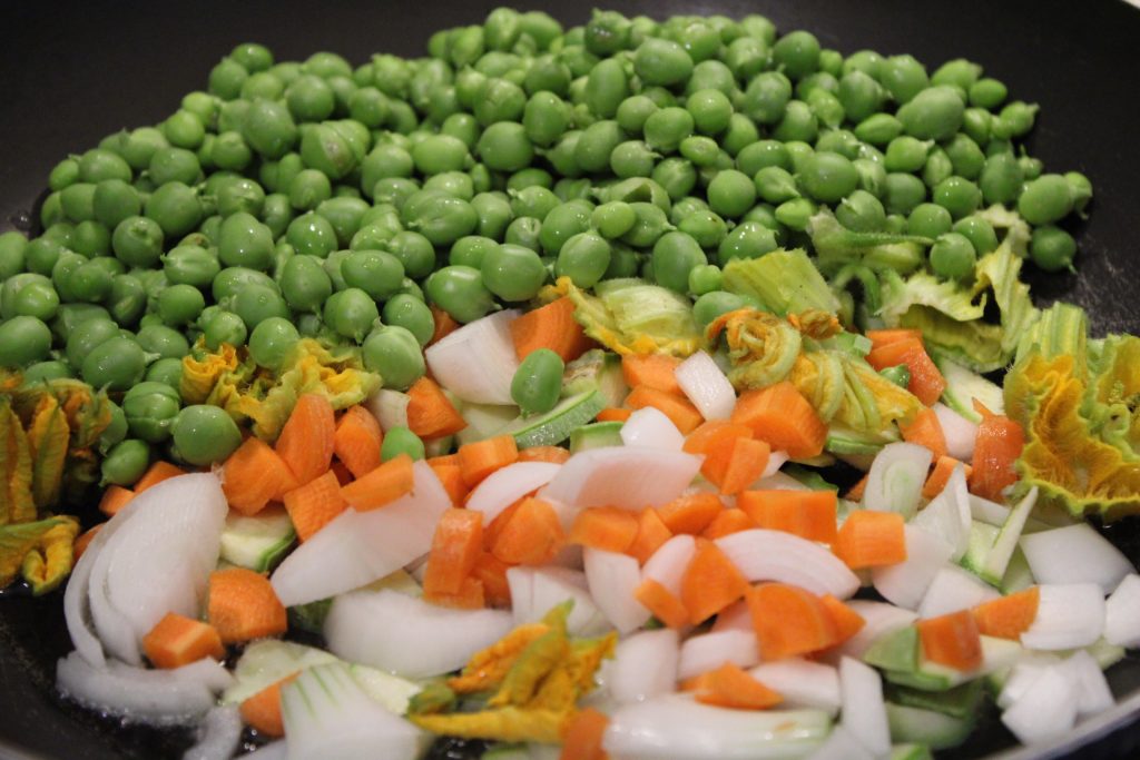 • Clean and cut the vegetables, sauté in a pan with a little oil