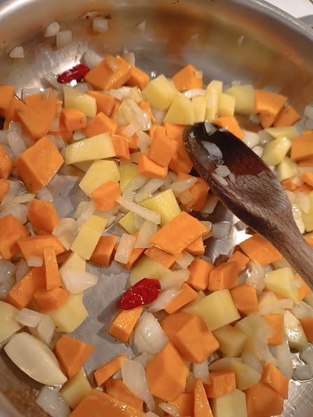 After chopping all the vegetables, mincing the onion, fry them in a large pot, along with the garlic, choose whether to add it whole or minced, depending on individual taste, and the chili pepper