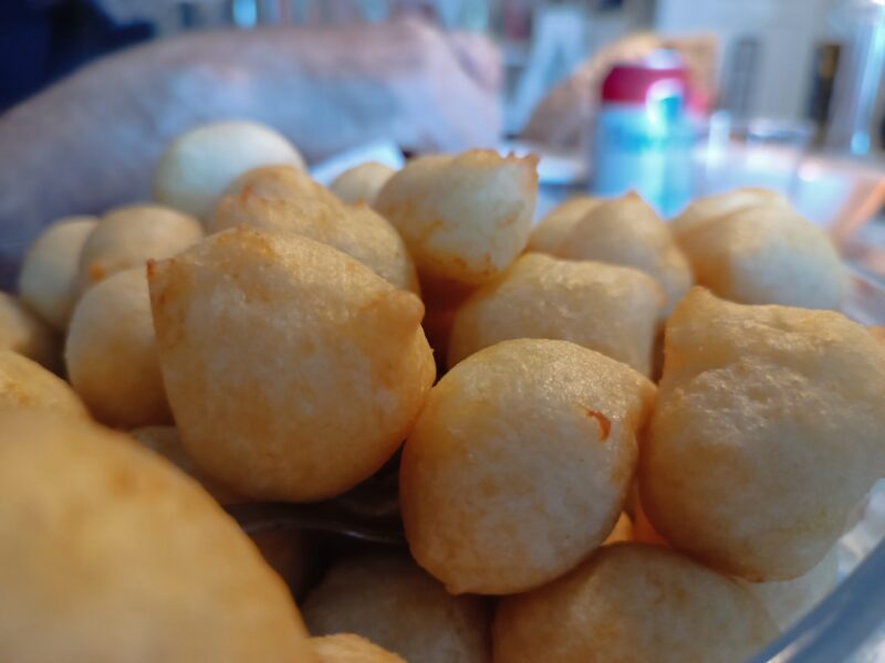 Once risen, transfer into a piping bag and make a cut about three-quarters of an inch wide. I use disposable ones, even though I’m generally against it, I allow myself this waste every now and then because I haven’t found my ideal piping bag yet. With thumb and index finger greased, drop a piece of dough at a time into hot oil.