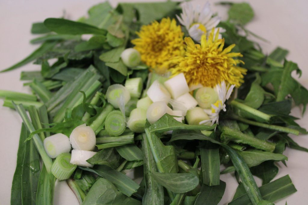 - 1 omelet (Made with 4 eggs, nettles, borage, chives, and wild arugula. Depends on the herbs found in the field. Chopped and mixed with beaten and salted eggs, no pre-cooking.)