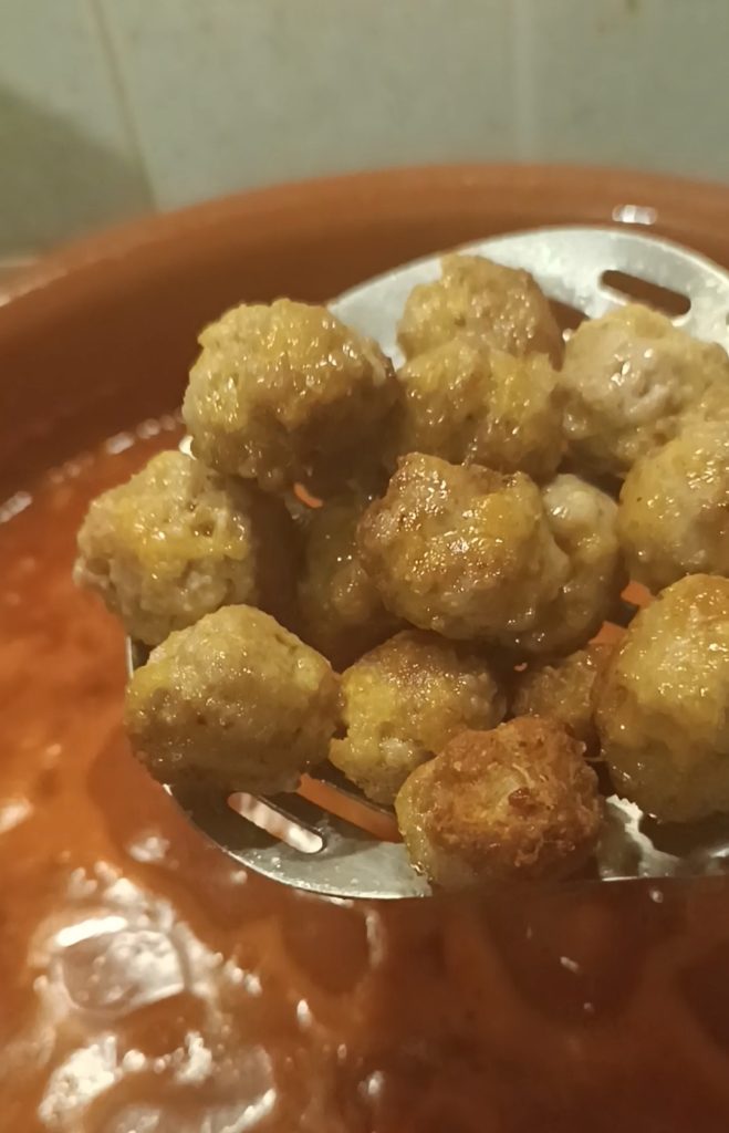 • Prepare the small meatballs with the ground beef, part of the grated cheese, breadcrumbs, finely chopped garlic and parsley, the eggs, nutmeg, black pepper. Mix well and form small meatballs that you will fry before adding them to the sauce. Continue slow cooking for about another hour. Calculate at least three hours of cooking in total.