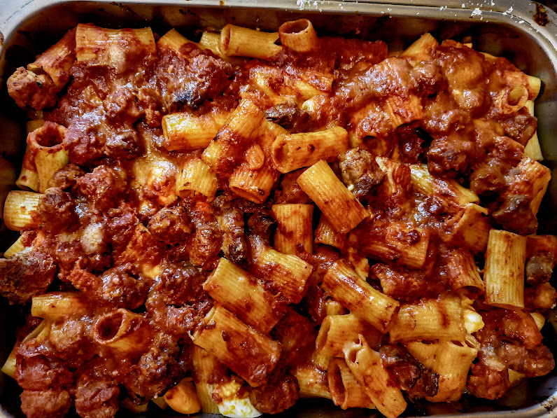 • In the meantime, cook the pasta in salted water, leaving it very al dente, and the eggs; prepare your baking dish and the mozzarella cut into cubes. Mix the rigatoni with your rich meat sauce, after draining them, and arrange half in the baking dish add the eggs, mozzarella, and a sprinkle of Grana.