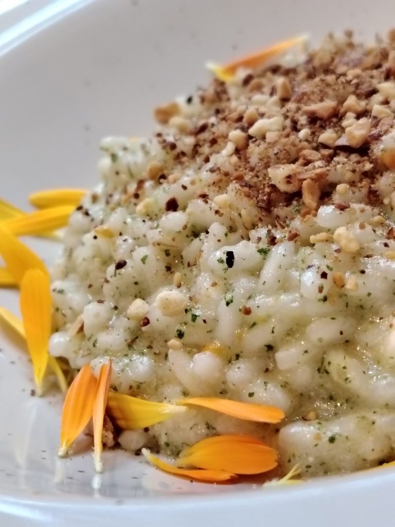 Risotto Hills of Langa recipe. A taste of fragrant memories. Some recipes are born not only from the meeting of ingredients but also from the whisper of memories, from scents that sneak into memory and resurface vividly with every taste. This risotto, which I decided to name Hills of Langa is a tribute to a generous land, a corner of Piedmont where the sweetness of the slopes meets the intensity of flavors, where the air smells of wild herbs, and history intertwines with the simplicity of authentic cuisine. Imagine spring mornings, when the light breeze caresses the still bare vineyards and carries with it the distant echo of work in the fields; during those hours, the scents of the damp earth mingle with the first fragrances of the herbs. Which timidly sprout. A prelude to the olfactory symphony that will explode with the arrival of the beautiful season. Herb San Pietro, chives, nettles, and marjoram. Familiar scents that evoke walks along the paths, the search for a shady spot under a centuries-old walnut, the light rustling of leaves. And then there’s the Roccaverano, a dairy treasure…