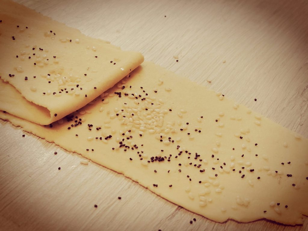 Roll out the trimmings with the rolling pin, sprinkle them with sesame and poppy seeds, brush with olive oil, and bake; they will make excellent crackers