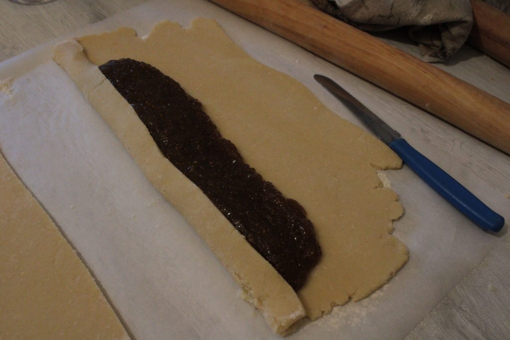 Once the time has elapsed, roll out the pastry and fill with fig jam and chopped walnuts.