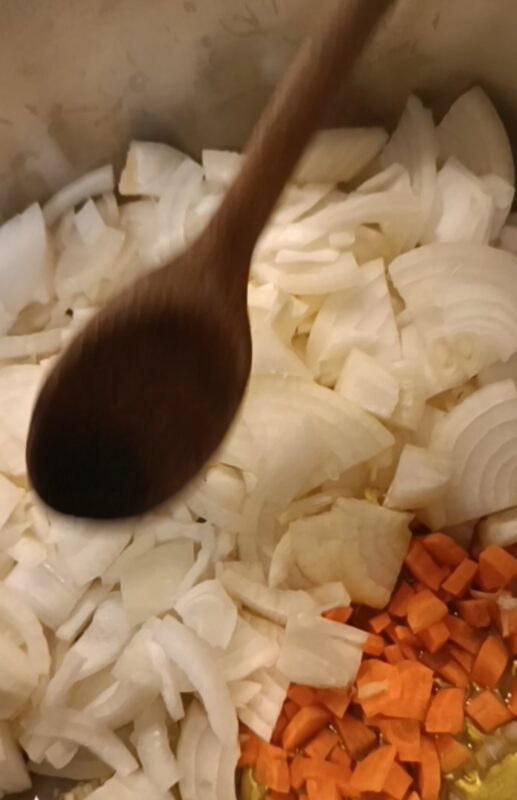 Slice the onions thinly, chop the carrots into small chunks, and sauté in olive oil; add the sliced fava beans and artichokes.