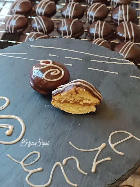 I chose the powdered sugar decoration, mixed the powdered sugar with a little water and a bit of cocoa to get a hazelnut color, and drew the initial letter of my last name or three thin parallel lines on the kisses